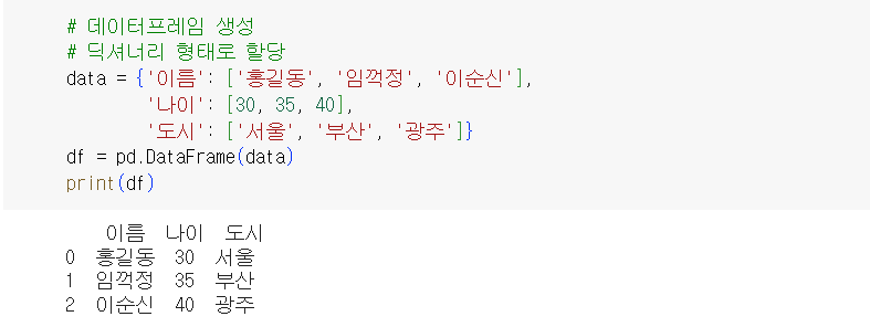 2. DataFrame의 각 열(Column)은 사실상 하나의 Series 객체. → 여러 Series 객체의 결합으로 이루어진 2차원 구조가 DataFrame
