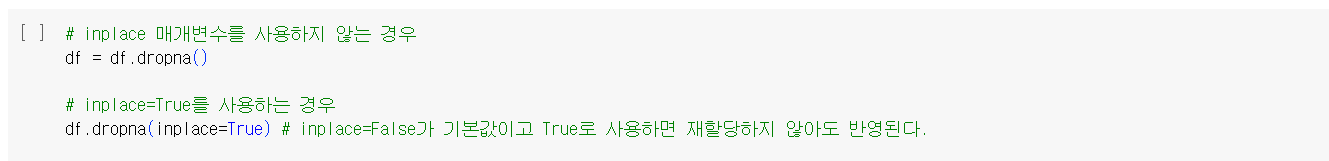 : Pandas의 대부분의 메서드에서는 DataFrame의 복사본을 수정하고, 원본은 그대로 유지한다. 따라서 inplace=True 사용 시 복사본을 만들지 않고 원본 DataFrame을 직접 수정한다. 이는 메모리 사용량을 줄일 수 있고, 코드의 간결성을 높일 수있다. (dropna() : 결측치가 있는 행이나 열을 제거)