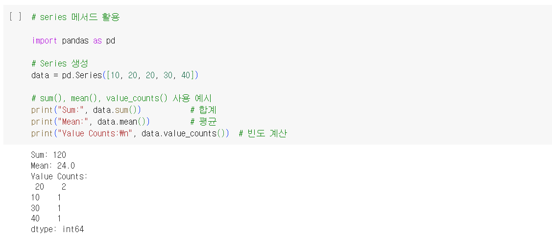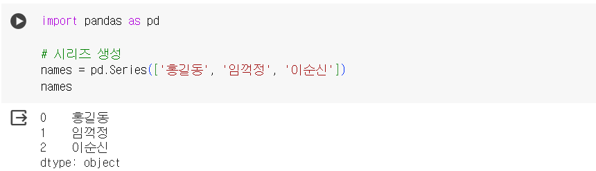 - df['column_name']을 사용하여 단일 열 선택 → 이 방법으로 선택된 열은 Series 객체