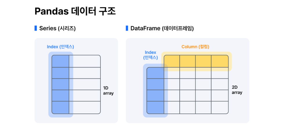 Series는 1차원 배열과 유사한 구조이며, 엑셀의 열을 의미한다. DataFrame은 2차원 테이블 형태의 데이터 구조이고, 엑셀에서 보는 표 형태를 의미한다. Series를 여러개 모은 딕셔너리나 데이터가 Pandas의 DataFrame이라고 생각하면 된다.