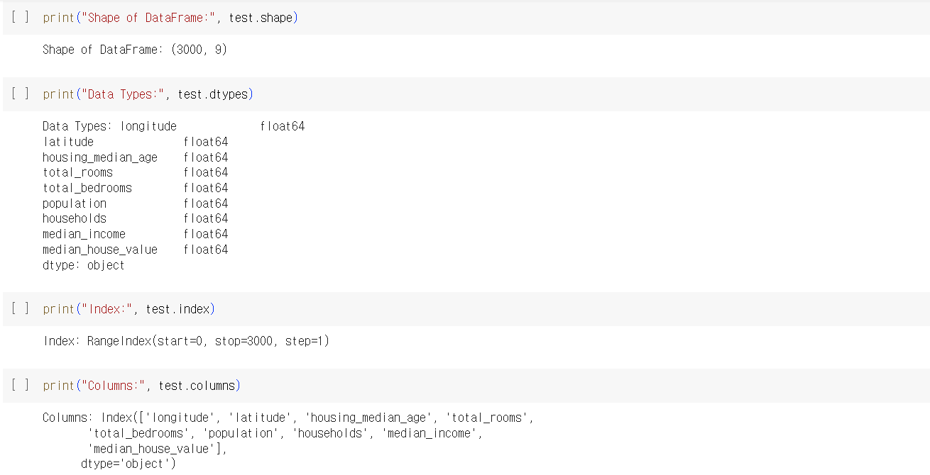 - 각 열의 데이터 타입, 누락된 값의 수, 메모리 사용량 등 확인.