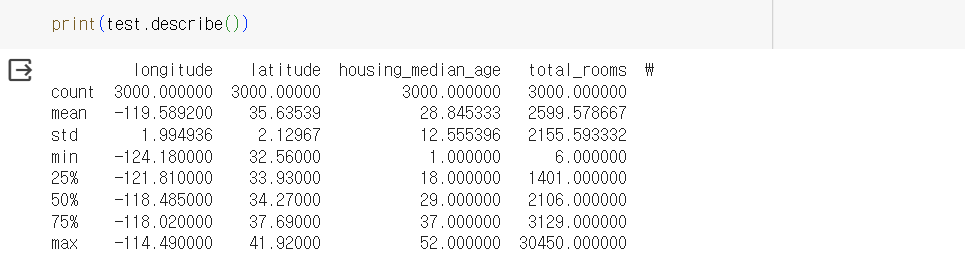 - 평균, 표준편차, 최소값, 최대값 등을 확인