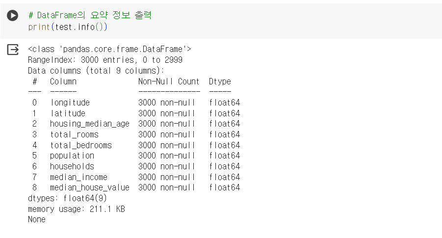 - 각 열의 데이터 타입, 누락된 값의 수, 메모리 사용량 등 확인.