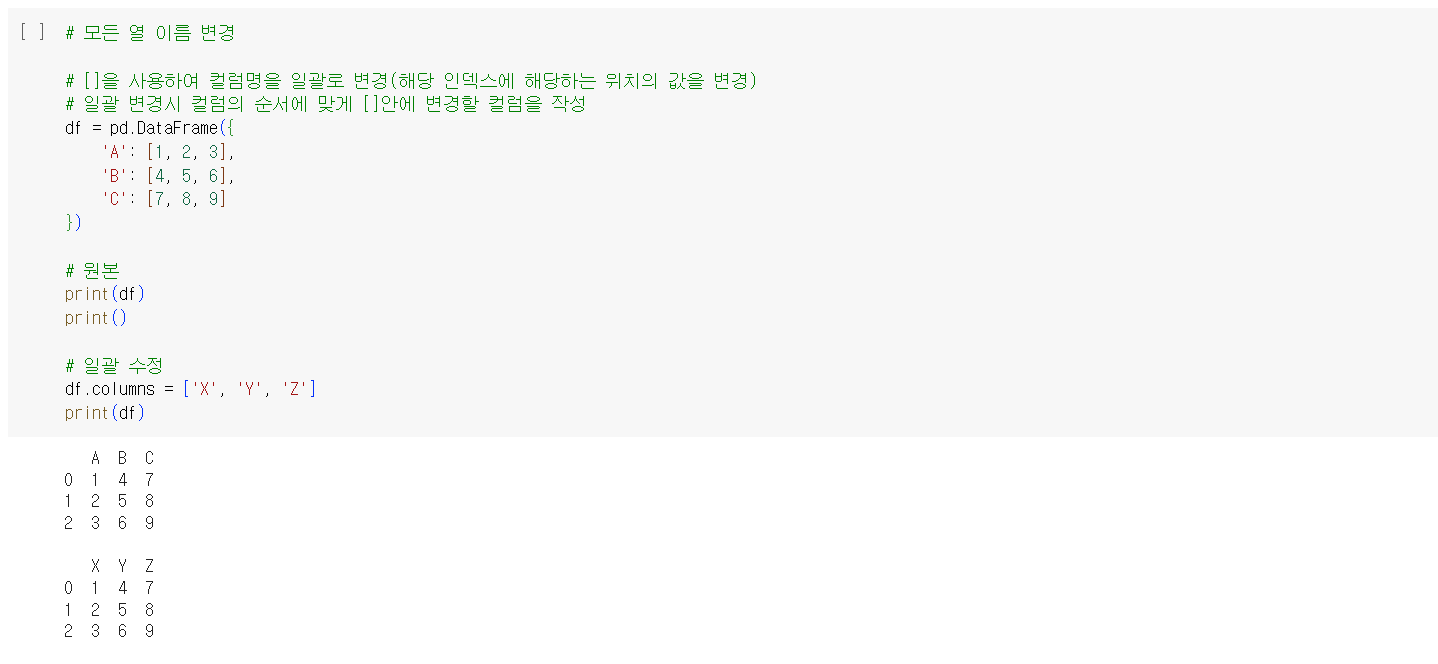 - DataFrame의 columns 속성을 직접 설정하여 모든 열 이름을 한번에 변경 가능.